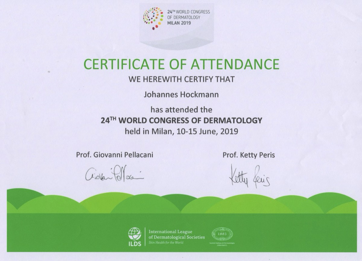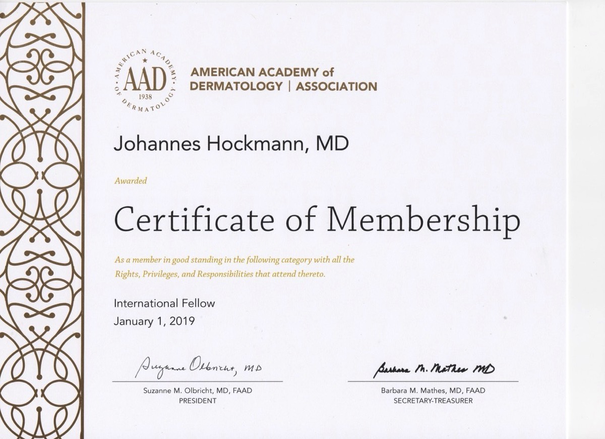 Zertifikat der Deutschen Dermatologischen Akademie über "Medizinisch-Dermatologische Kosmetologie" und über "Dermatologische Lasertherapie"